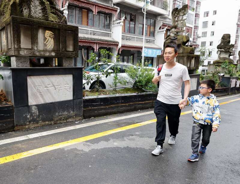 5月10日,在贵州省正安县,邹星送孩子上学。