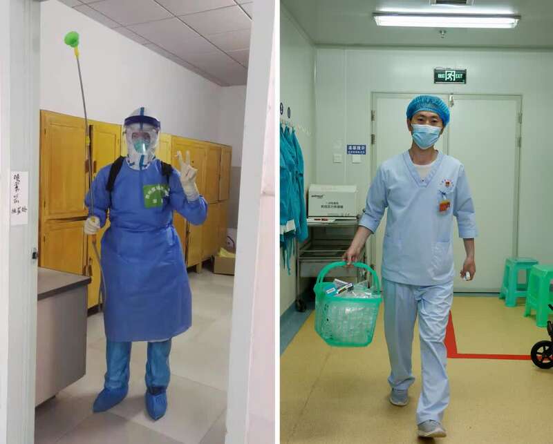 拼版图片:左图为2020年3月14日,邹星在湖北省武汉市武钢第二职工医院进行消毒消杀工作(受访者供图);右图为2021年5月10日,邹星在贵州正安县人民医院重症医学科取送药物。
