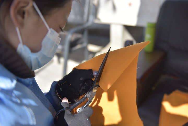 西藏古传民族手工有限公司的员工正在进行布料裁剪。 新华社记者 柳新勇 摄