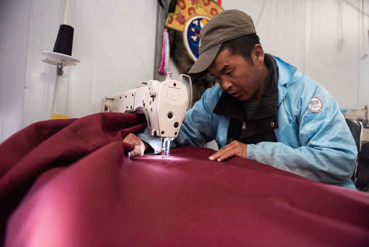 走进厂房,只能听见缝纫机转动的声音。平措占堆坐在缝纫机前,双眼盯着跳动的针头,手推深红色布料伸展开去,这是制作藏式门帘的步骤之一。