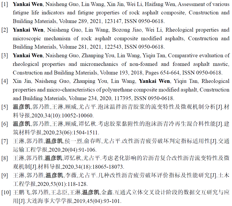 截至目前,温彦凯同学已发表论文10余篇,其中以第一作者身份发表SCI一区期刊《Construction and Building Materials》论文3篇,以第一作者身份发表EI检索期刊论文2篇,以共同作者身份发表SCI及EI检索期刊论文5篇。 然而,这些论文的发表并不顺利,有时一篇文章3位审稿人会提出多达五六十条审稿意见, 他都逐条斟酌,认真回复,一次次的修改及回复使他变得更加严谨,细致,科研及写作能力大幅提升。 现在回想起来,他觉得这个过程真的是一个磨炼意志的过程,同时面对两三篇文章多达上百条的审稿意见,确实需要静下心来,沉住气,一条一条地思考并回复。通过这样的磨练,温彦凯同学已经变得更加沉稳,细致和耐心。