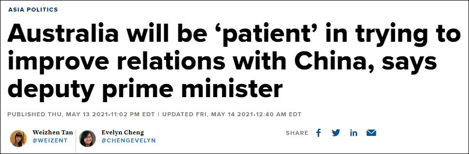 据美国消费者新闻与商业频道网站(CNBC)5月14日报道,澳副总理麦科马克(Michael McCormack)周四在《亚洲财经论谈》(Squawk Box Asia)节目上被问到这个问题时,他称,“我们会保持耐心,而且我们一直很有耐心。”