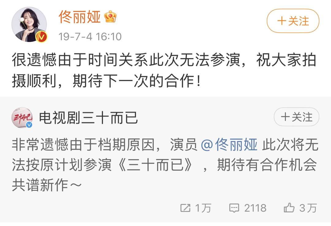 而后,《三十而已》官方微博发布消息称,因为档期原因,佟丽娅无法按照原计划参演《三十而已》,佟丽娅也转发该条微博解释,确实由于时间关系无法参演。