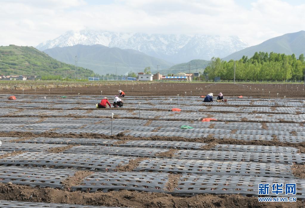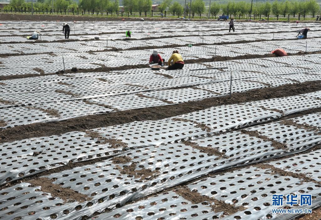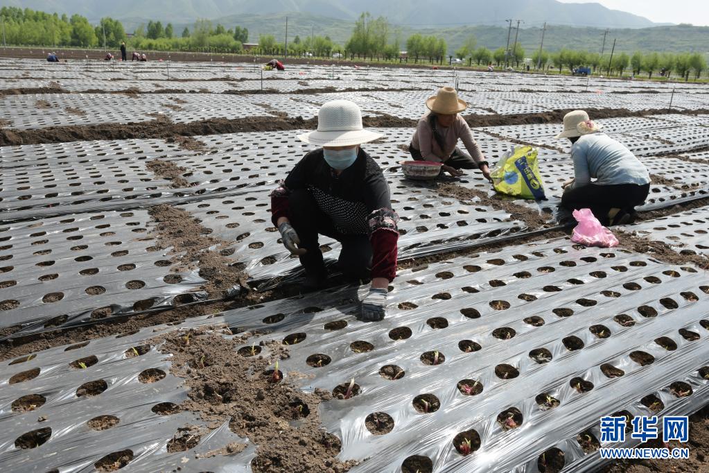 临夏县尹集镇农民在田里栽植葱苗(5月16日摄)。