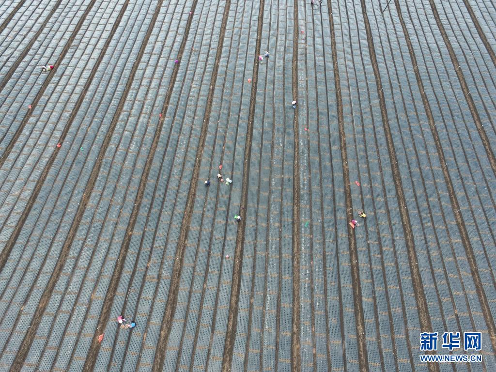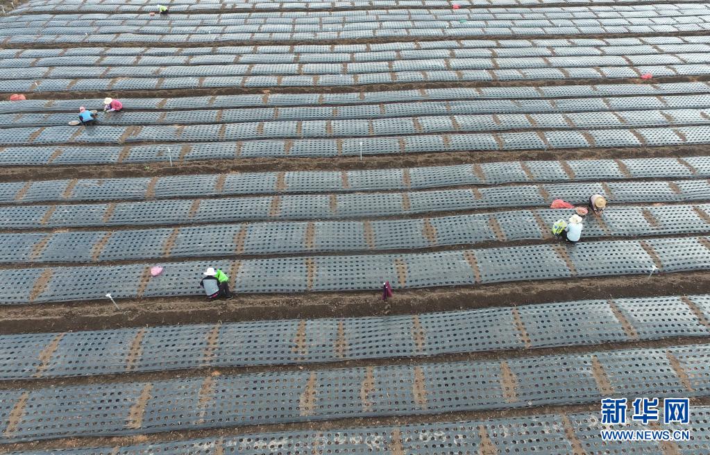 临夏县尹集镇农民在田里栽植葱苗(5月16日摄,无人机照片)。新华社发(史有东 摄)