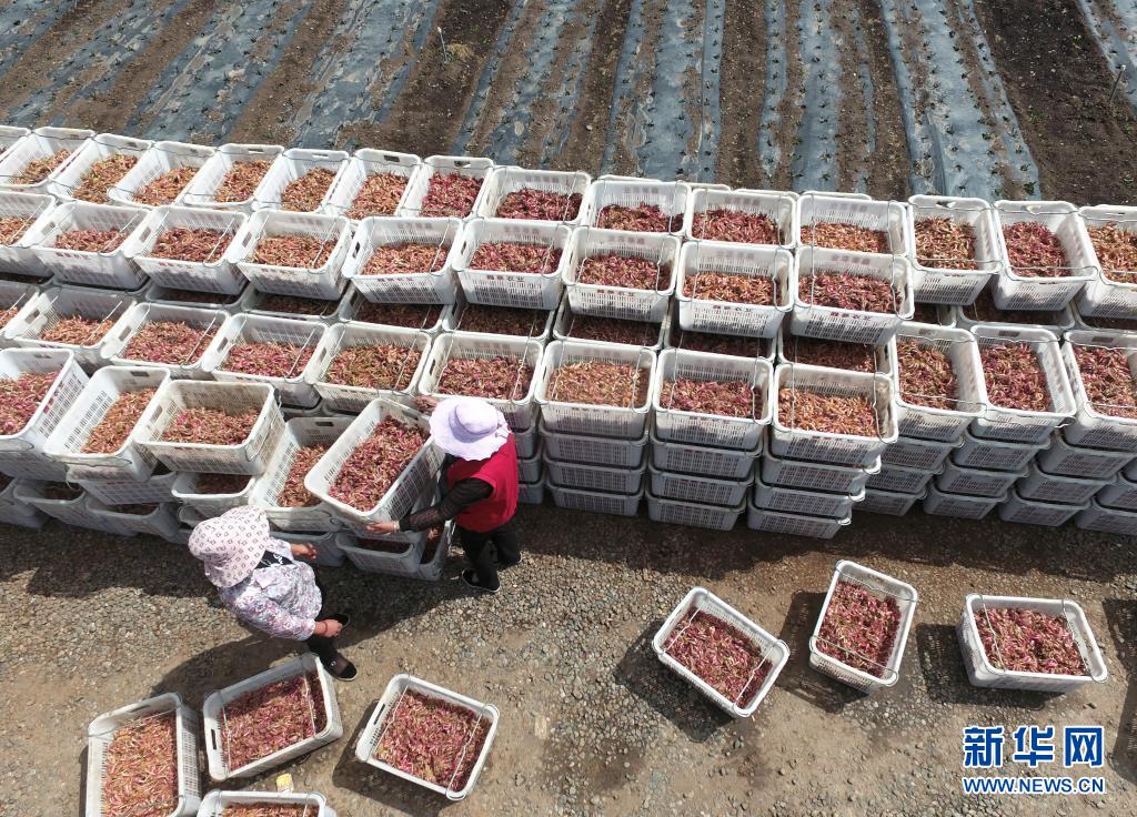 临夏县尹集镇农民在田间搬运葱苗(5月16日摄,无人机照片)。新华社发(史有东 摄)