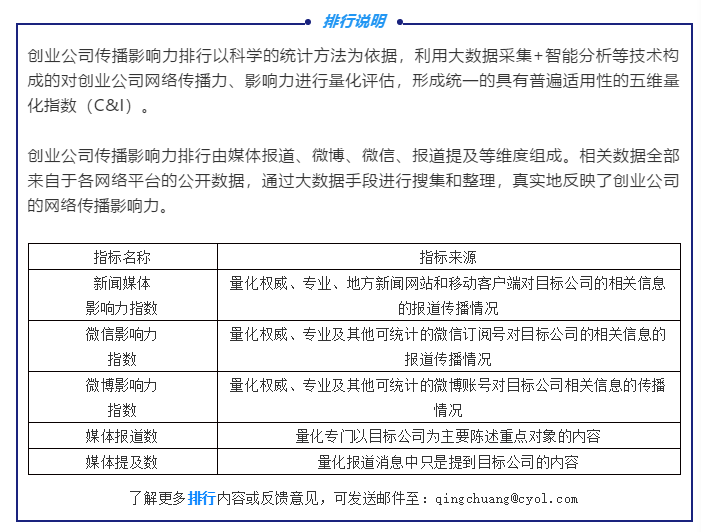 创业公司传播影响力排行由青创头条数据分析团队、中青华云联合出品,利用大数据采集+智能分析等技术评估、量化创业公司在互联网中传播力、影响力,通过客观的数据结果让创业者、投资人、商业人士可以更高效、更准确地掌握创新行业、公司的发展状况和网络影响力。下一步,本产品将进一步评估、分析创业公司网络传播影响力强的事件和产品服务的网络影响力,提供行业分析报告、数据产品。