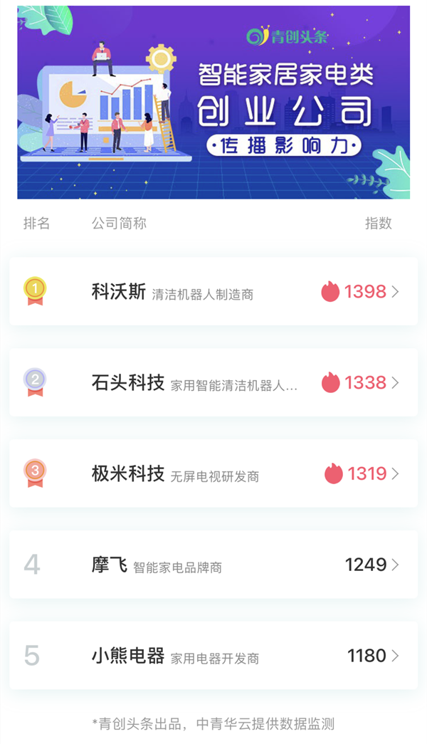 根据青创头条发布的2021年4月智能家具家电类创业公司传播影响力TOP5中,科沃斯、石头科技、极米科技、摩飞、小熊电器进入前五。