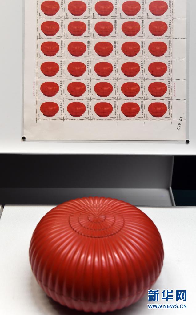 这是展出的菊瓣形朱漆盒(下)与《中国古代漆器》特种邮票(5月17日摄)。