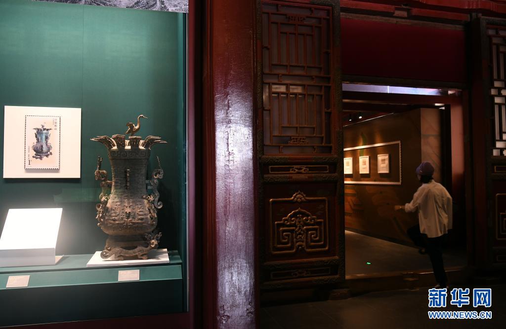 这是展出的铜莲鹤方壶(复制品)(右)与《东周青铜器》特种邮票(5月17日摄)。