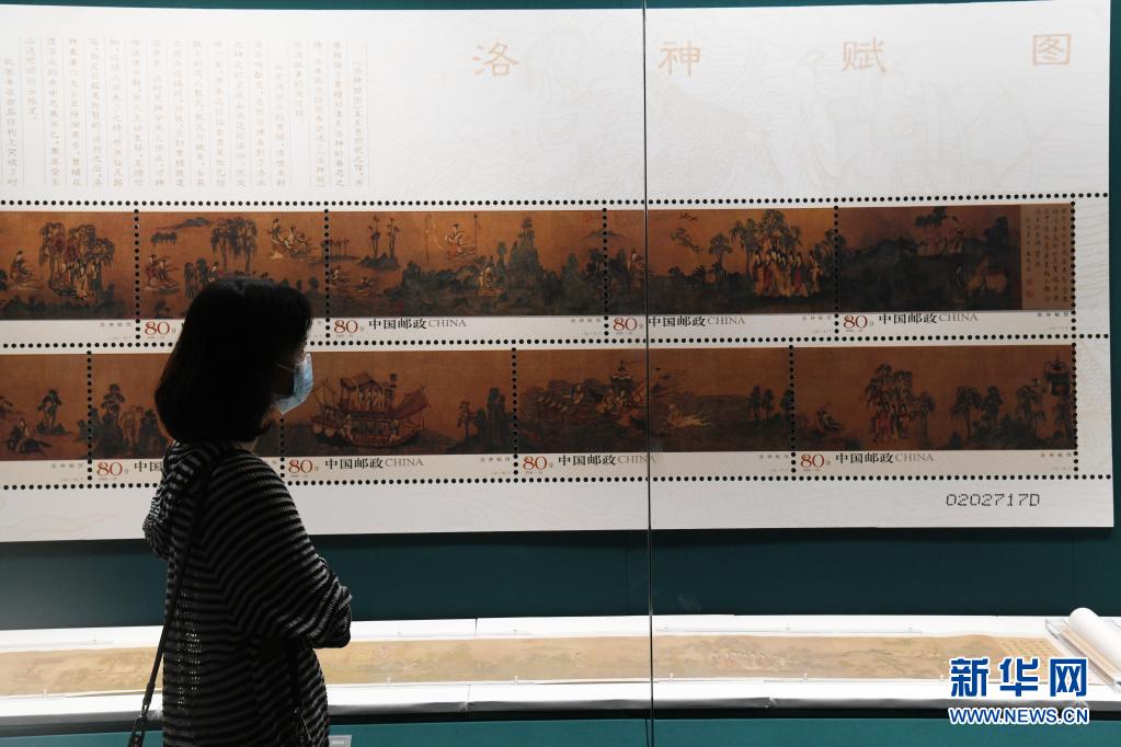 5月17日,一位记者观看展出的《洛神赋图》特种邮票。