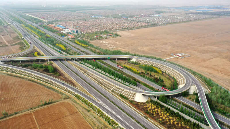 这是福银高速延伸段宁夏银川市永宁县闽宁镇路段和闽宁镇(4月26日摄,无人机照片)。新华社记者 王鹏 摄