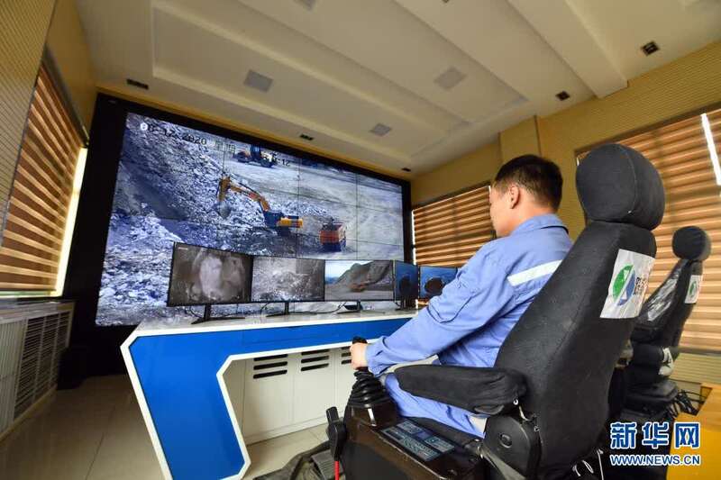 河南洛钼集团工作人员在操控基于5G网络传输条件下的自动驾驶挖掘机(2020年8月12日摄)。新华社记者 李嘉南 摄