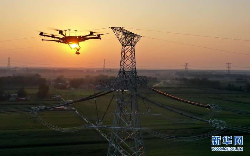 基于5G网络传输条件下的无人机在青海—河南±800千伏特高压直流输电工程豫南换流变电站外巡检(2020年8月27日拍摄,无人机照片)。新华社记者 李嘉南 摄