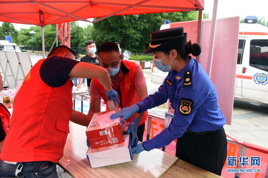 5月20日,在封闭管控的六安恒大御景湾小区,董洁(右一)协助搬运居民购买的生活物资。董洁是六安市裕安区城管局(支队)队员,为落实疫情防控措施,配合属地开展疫情防控工作,她被派驻到中风险区恒大御景湾小区值守,帮助居家隔离人员转运生活物资、登记信息、协助环境消毒等。