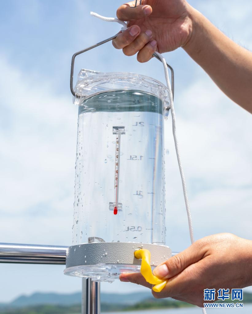 5月20日,在湖北省丹江口市丹江口水库的坝前监测断面,南水北调中线水源公司库区水质监测人员展示采集的水样。新华社记者 才扬 摄