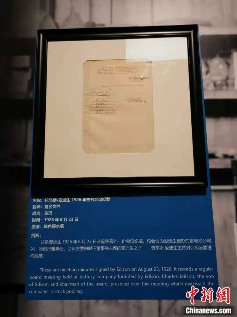 不同于传统的器物类展示,在“光电之迹”展览中,许多名人手迹的藏品都是首次亮相。展览视觉统筹、西元收藏联合创始人刘潮以“发明大王”托马斯·爱迪生的手迹举例,1926年爱迪生的蓄电池公司的一份会议纪要中,在爱迪生飘逸的署名下,大家还发现了他儿子查尔斯·爱迪生的签名。