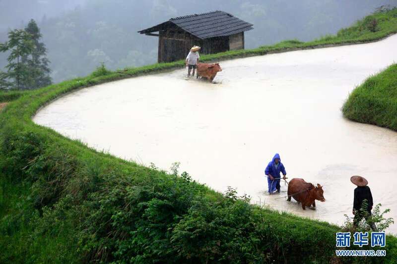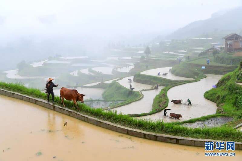 5月23日,贵州省黔东南苗族侗族自治州黎平县尚重镇上洋、下洋、岑埂等村的农民牵着耕牛来到岑丈梯田,参加“千牛同耕”活动,向游客展示当地传统农耕文化。