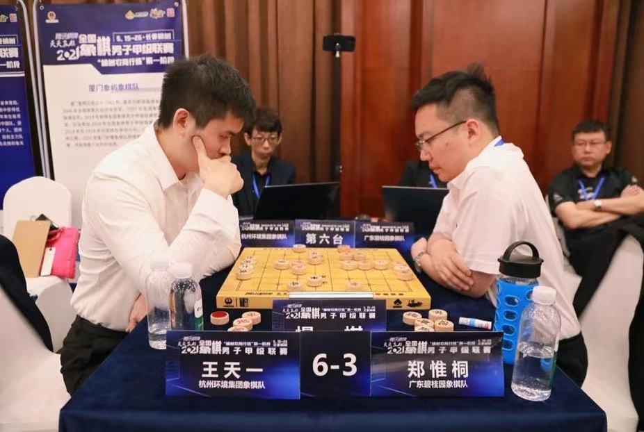 在本场比赛前,郑惟桐跟现役象棋第一人王天一已上演“王郑大战”。面对王天一时,郑惟桐在两名队友接连取胜的优势下,轻装上阵,而王天一则顶着开局不利的压力。首盘慢棋,二人最终势均力敌握手言和。加赛超快棋,两人出手如电,令人应接不暇,最终郑惟桐大破红方城池。