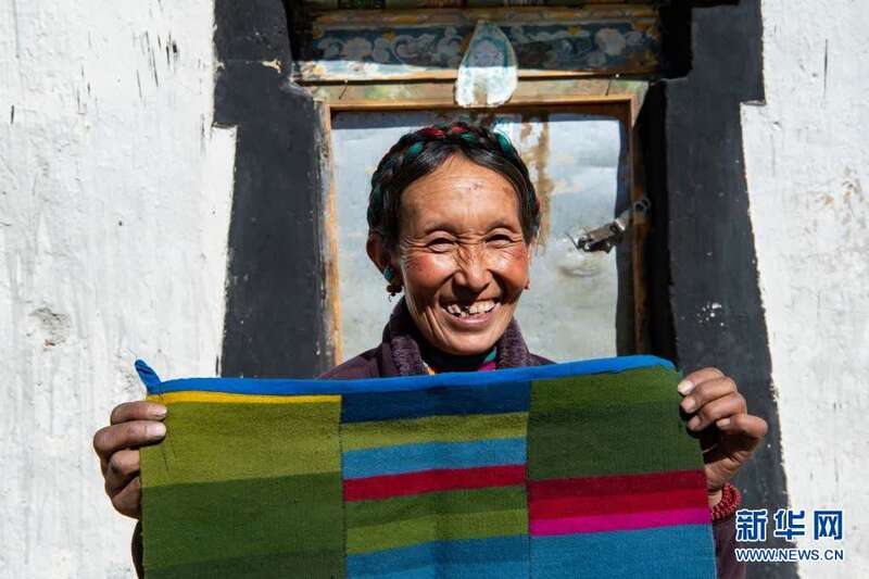 在珠峰脚下的西藏自治区日喀则市定日县扎西宗乡托桑林村,格桑展示自己编织的邦典(2020年1月20日摄)。邦典是藏族传统衣物装饰,是一种用于搭配藏装的毛织围裙。格桑曾是村里的建档立卡贫困户,靠着编织售卖邦典和各类政府补贴实现脱贫摘帽。