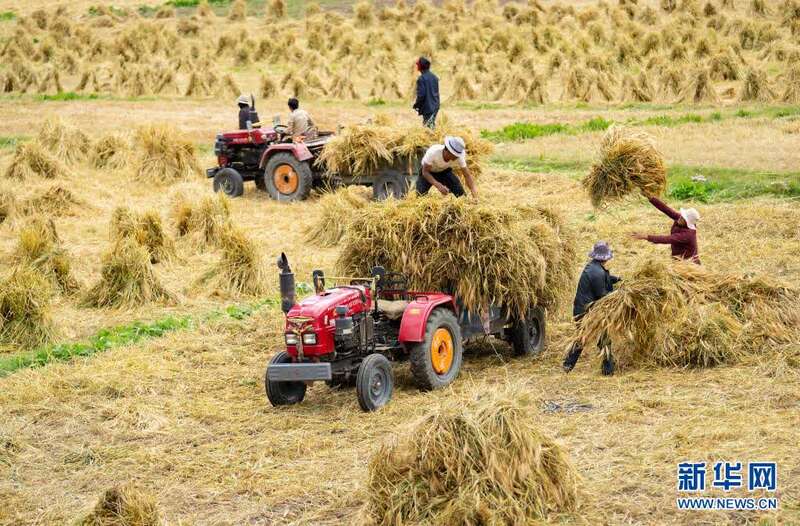 西藏昌都市八宿县然乌镇康沙村的村民在收青稞(2020年9月10日摄)。