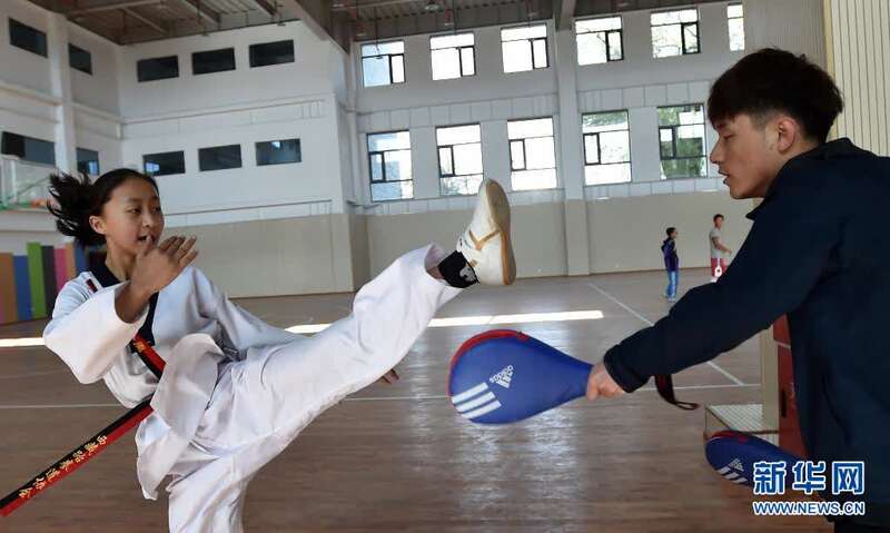 一名女孩在广东省援藏重点支持项目——西藏自治区青少年宫内练习跆拳道(2020年5月4日摄)。