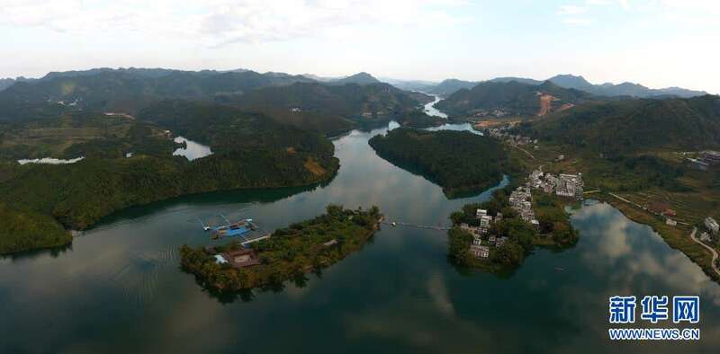 这是广西巴马瑶族自治县赐福湖和长寿岛景观(2018年11月8日摄,无人机照片)。