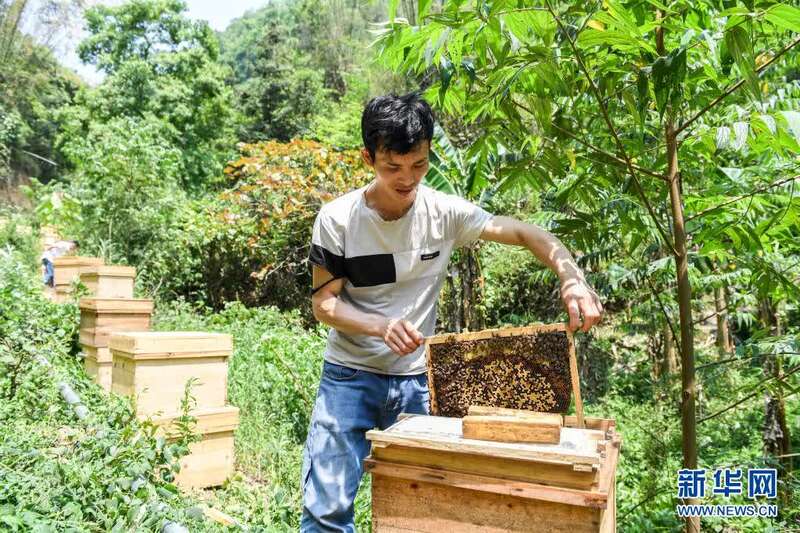 广西百色市乐业县新化镇百坭村村民班华六在查看蜂巢(2020年4月20日摄)。