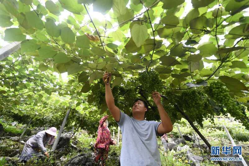 在广西都安瑶族自治县下坳镇隆坝村龙磊屯的毛葡萄示范基地,村民在管护葡萄(2019年7月24日摄)。
