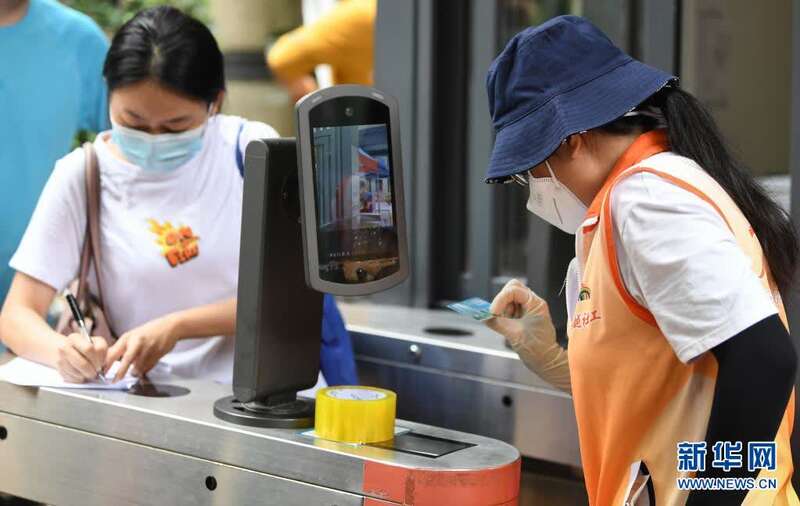 5月29日,在广州荔湾区白鹤洞街广钢新城一小区出入口,社区工作人员(右)对必要外出的居民进行核实登记。 新华社记者 邓华 摄