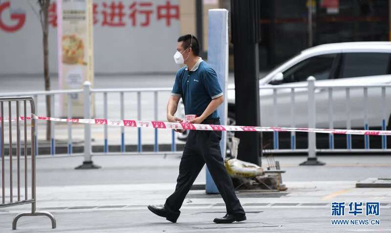 5月29日,在广州荔湾区白鹤洞街广钢新城街道,物业工作人员拉起安全警戒线。 新华社记者 邓华 摄