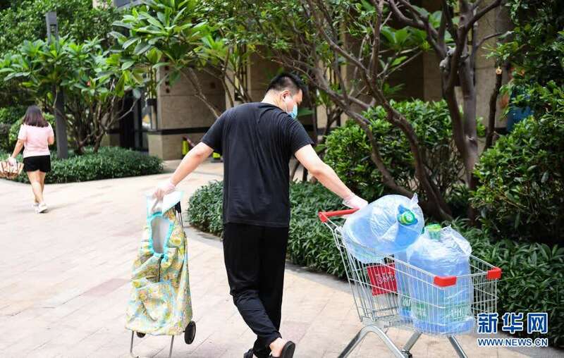 5月29日,在广州荔湾区白鹤洞街广钢新城一小区,居民把订购的纯净水运回。 新华社记者 邓华 摄