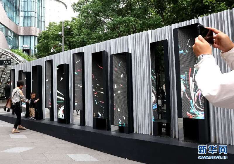 5月28日,游客在上海新天地“幻彩屏风”艺术装置前游玩。