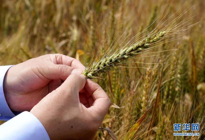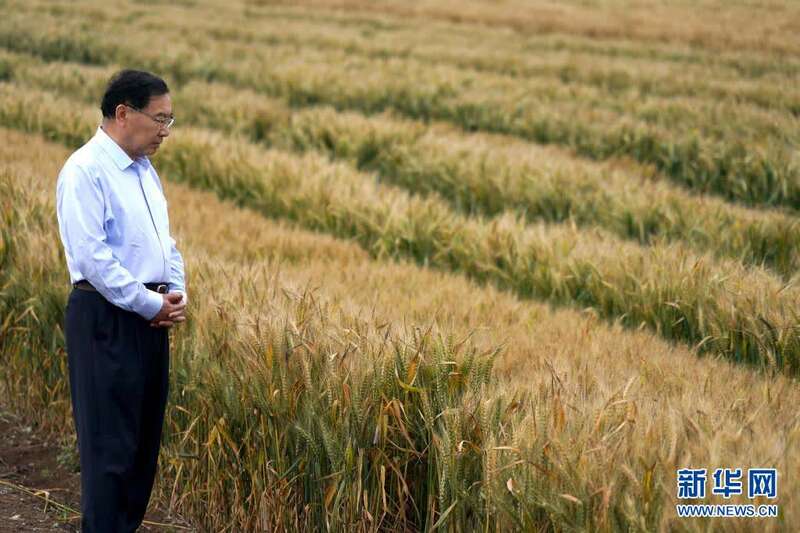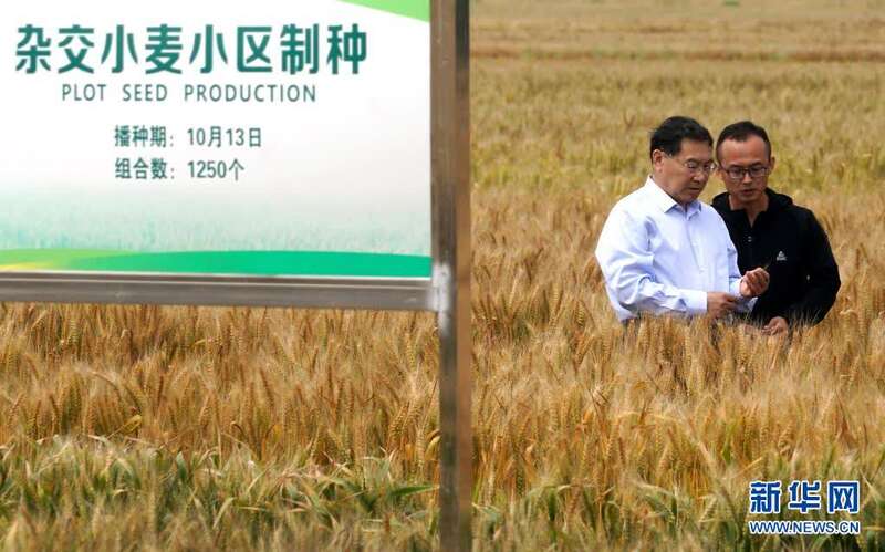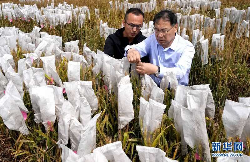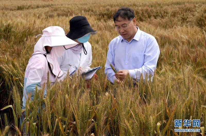 在位于河南省邓州市的国家杂交小麦项目产业化基地的试验田里,赵昌平在进行小区制种组合调查及评价(5月26日摄)。