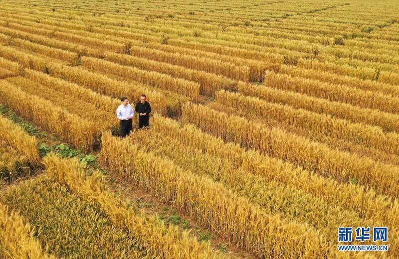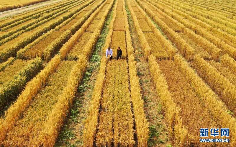在位于河南省邓州市的国家杂交小麦项目产业化基地的试验田里,赵昌平(左)和助手在进行小区制种产量性状调查(5月26日摄,无人机照片)。
