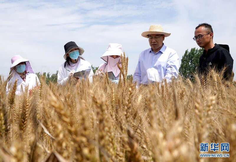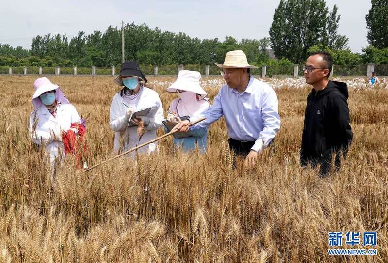 在位于河南省邓州市的国家杂交小麦项目产业化基地的试验田里,赵昌平(右二)带领研究团队进行种质资源田间评价(5月26日摄)。