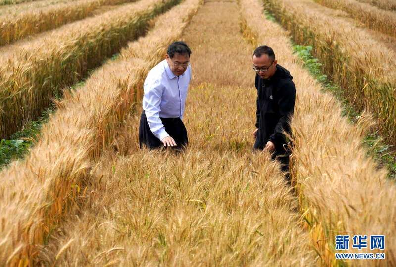 在位于河南省邓州市的国家杂交小麦项目产业化基地的试验田里,赵昌平(左)和助手在进行小区制种田间评价(5月26日摄)。