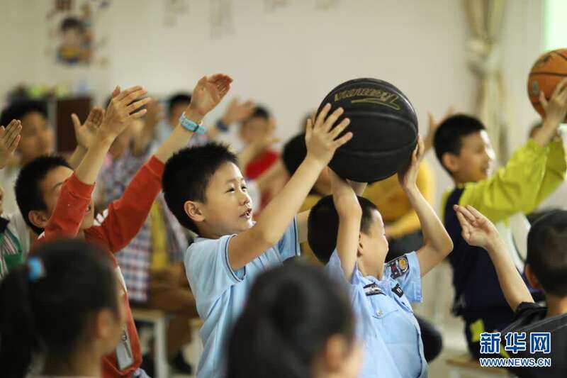5月29日,在赤水市市中街道滨西社区益童乐园,孩子们在进行拍篮球比赛。