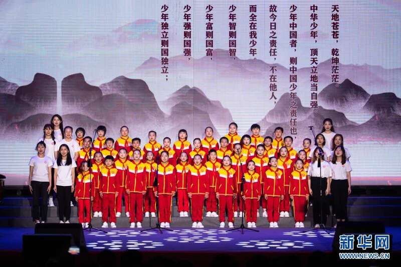 5月30日,在湖南科技大学俱乐部,启航学校儿童合唱团成员和湖南科技大学学生在朗诵诗歌《少年中国说》。新华社记者 陈思汗 摄