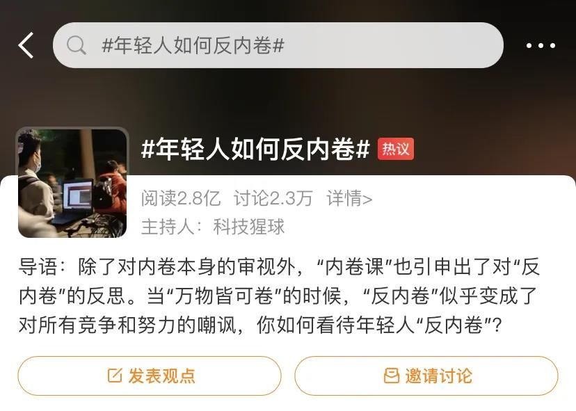 清华大学大一学生开设了名为《摸鱼学导论》的课程;《新周刊》在2021年五四青年节前夕提出“反卷青年”的概念,鼓励年轻人勇敢说“不”;新浪微博也开辟了一个名为“年轻人如何反内卷?”的话题......越来越来多的年轻人加入了反内卷的行列,在汹涌的人潮中找到自己的呼吸孔。
