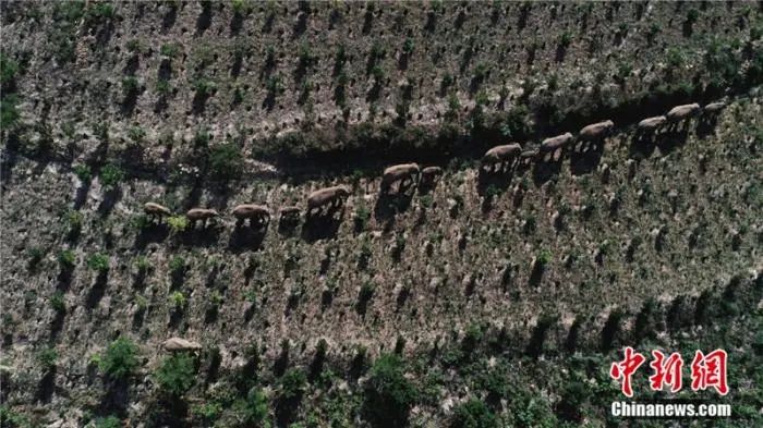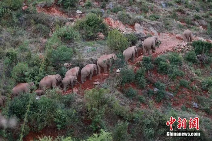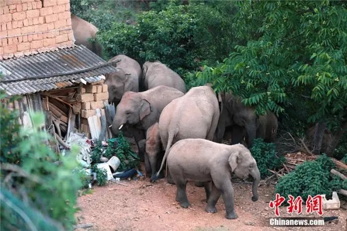 5月30日,云南北迁象群进入玉溪市红塔区大湾村境内 视频来源:中新视频