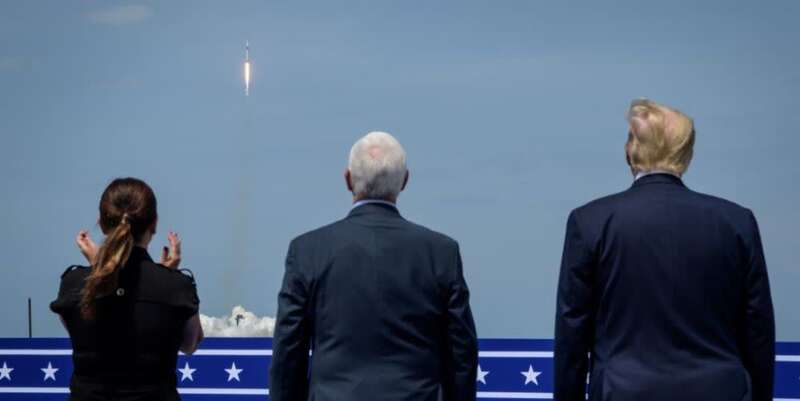 2020年5月30日,在美国佛罗里达州肯尼迪航天中心,时任美国总统特朗普(右)和时任美国副总统彭斯(中)等观看载人版“龙”飞船搭乘“猎鹰9”火箭升空。(新华社发,美国国家航空航天局供图)