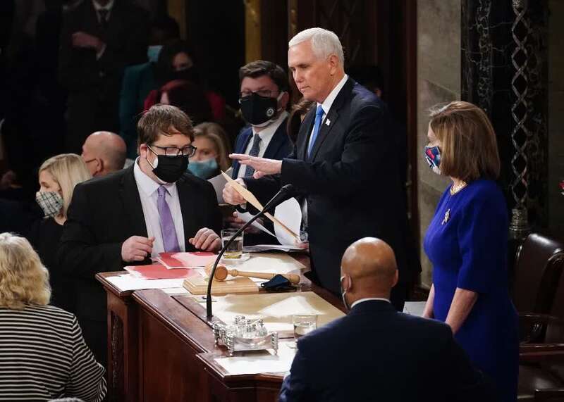 1月6日,在美国华盛顿国会大厦,时任美国副总统彭斯(中)和国会众议院议长佩洛西(右)出席国会联席会议。(新华社发,Pool图片,凯文·迪奇摄)