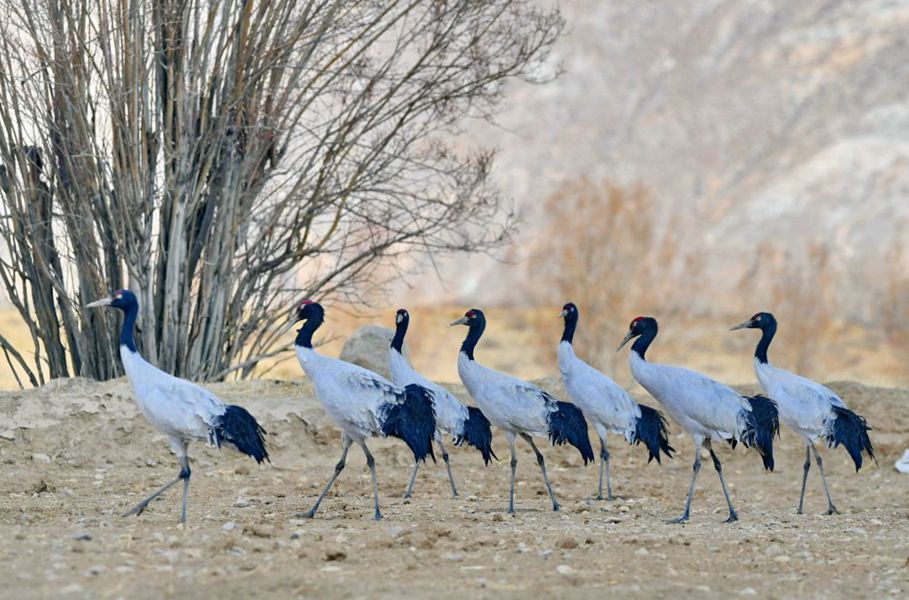 ↑西藏日喀则市南木林县艾玛乡田野里的黑颈鹤(2020年1月24日摄)。新华社记者 张汝锋 摄