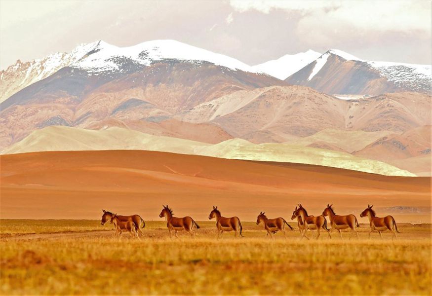 ↑羌塘国家级自然保护区内飞奔的藏野驴(2017年9月19日摄)。新华社记者 张汝锋 摄