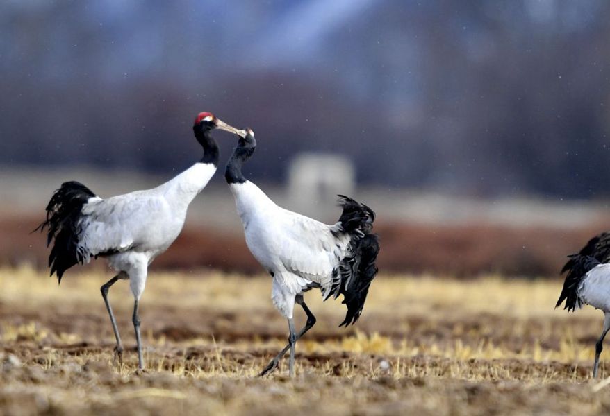 ↑黑颈鹤在林周县黑颈鹤自然保护区里“亲吻”(2021年3月14日摄)。新华社记者 张汝锋 摄
