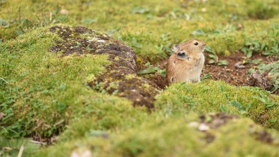 ↑西藏思金拉错湖边拍摄的高原鼠兔。(2019年7月6日摄)。新华社记者 周锦帅 摄