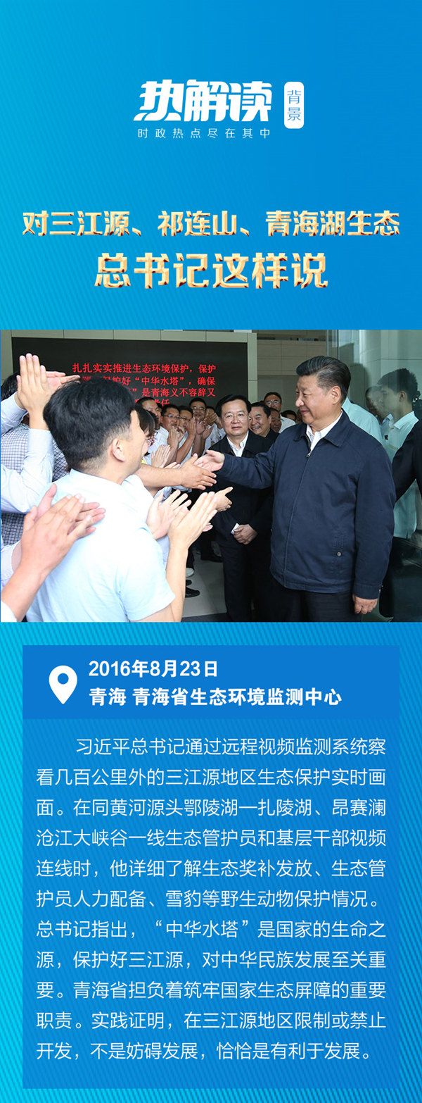 同年8月份,习近平总书记来到青海西宁市考察。在省生态环境监测中心,总书记结合多媒体演示,听取全省生态文明建设总体情况和三江源地区生态保护及国家公园体制试点工作情况介绍。考察期间,总书记进一步强调要搞好三江源国家公园体制试点。