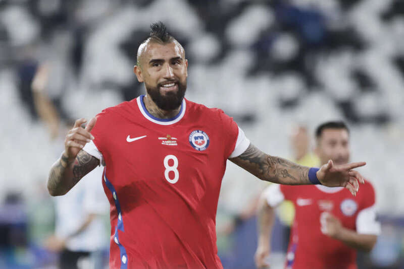 6月14日,智利队球员比达尔庆祝队友爱德华多·巴尔加斯的进球。新华社发(拉赫尔·帕特拉索摄)