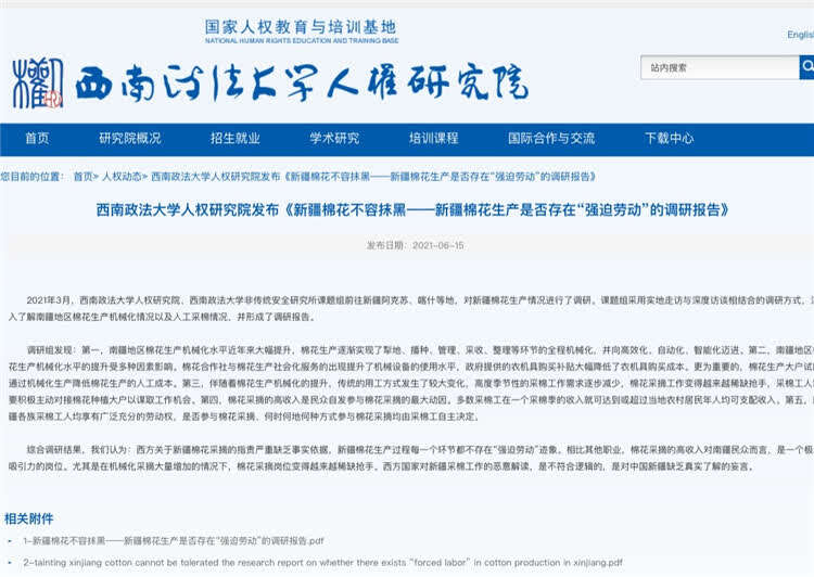 “这份报告的形成其实具有一定的偶然性。”报告作者之一、西南政法大学人权研究院副教授尚海明介绍,今年3月份,西南政法大学人权研究院和非传统安全研究所前往新疆进行“新疆社会发展”课题调研。刚到新疆的第二天,就发生了“新疆棉”事件,引起舆论哗然。